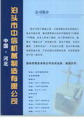 本公司技术力量雄厚,设备一流,工艺先进合理,管理规范,完全能满足不同用户的要求,我们公司的经营理念是:品质重于泰山、工作求实、产品求精。我们的宗旨是:以技术实力赢得市场,以诚实守信赢得用户。泊头市中信机械制造有限责任公司总经理樊文涛欢迎各位领导、各届朋友光临指导,洽谈合作。